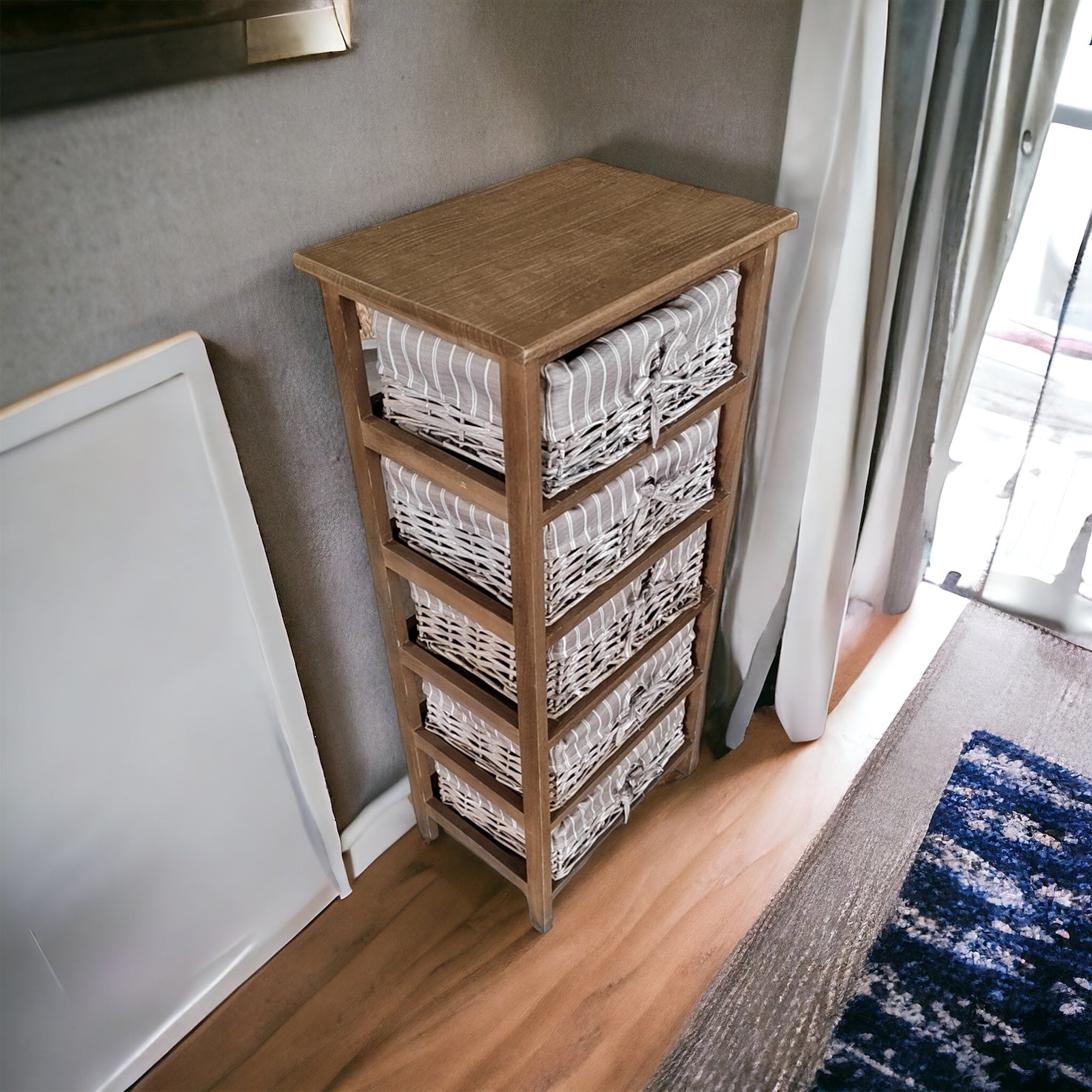 Fabricado con materiales de alta calidad, este mueble garantiza durabilidad y resistencia. Los canastos de mimbre, forrados en tela para mayor protección, ofrecen un espacio ideal para organizar y guardar tus pertenencias de forma ordenada y accesible.
