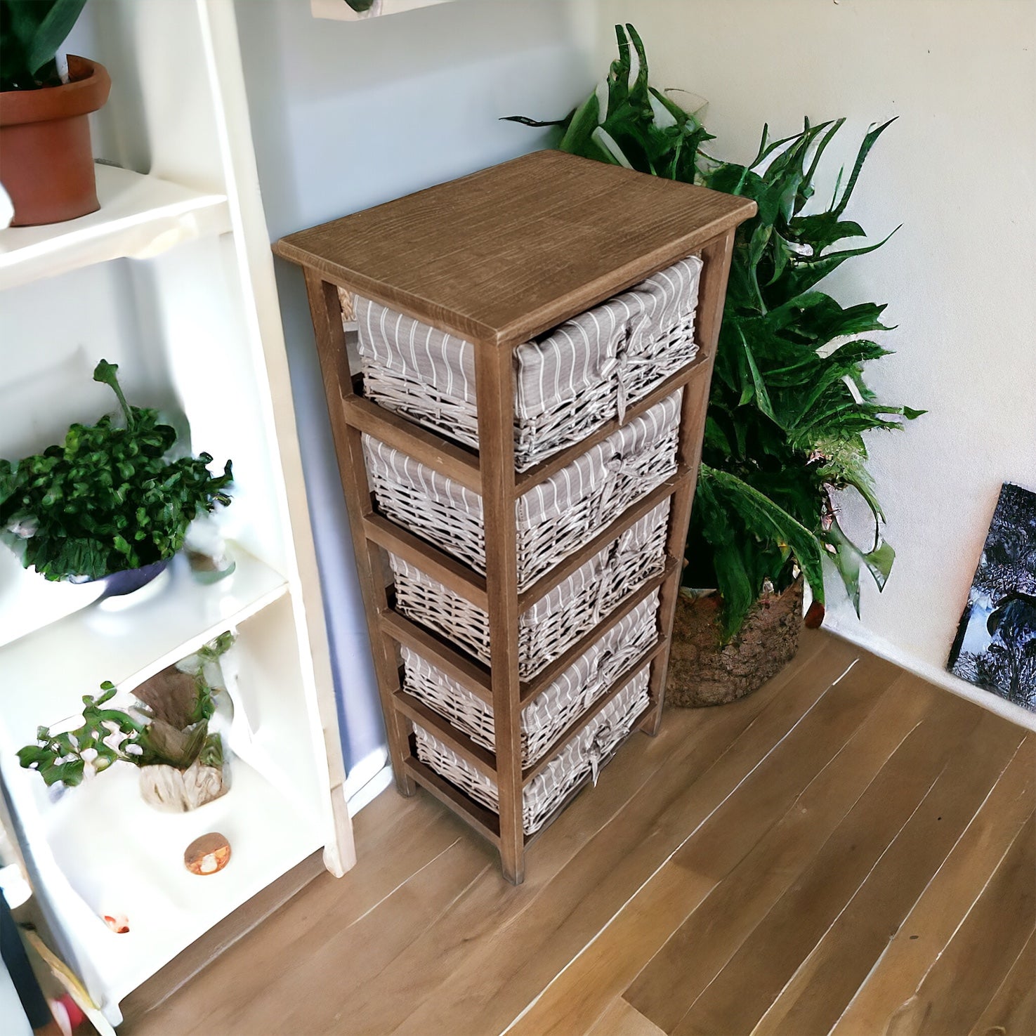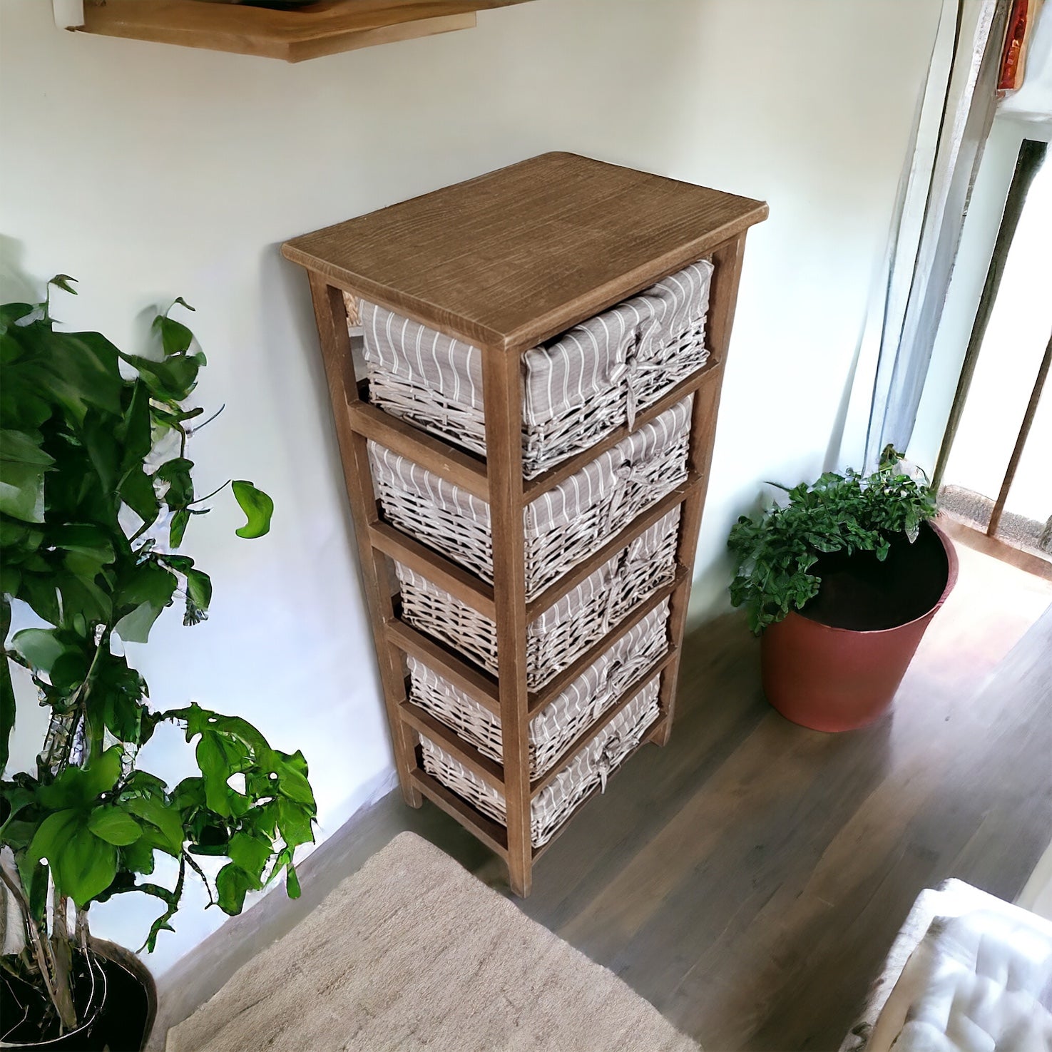 Dale un toque de encanto rústico a tu hogar con nuestro elegante mueble de estructura de madera y canastos de mimbre forrados en tela. Con un diseño cuidadosamente elaborado, este mueble combina la calidez de la madera con la funcionalidad del mimbre para ofrecerte una solución de almacenamiento práctica y estéticamente atractiva.