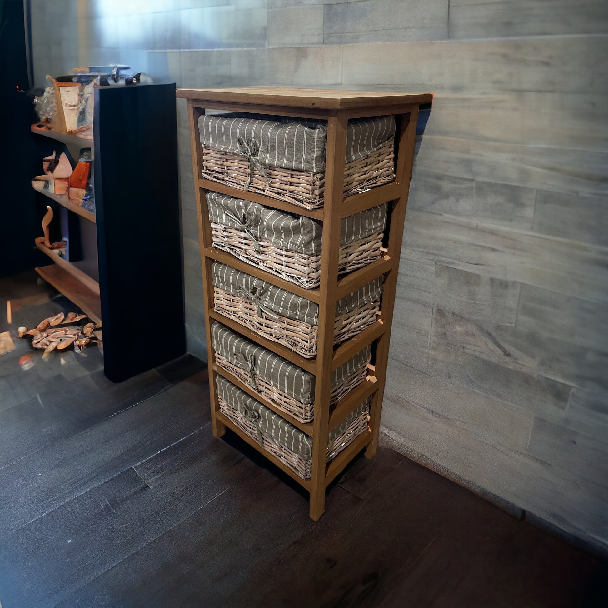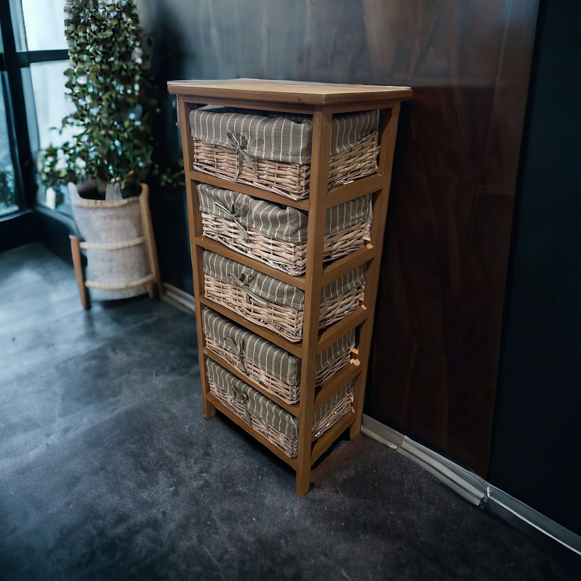 Dale un toque de encanto rústico a tu hogar con nuestro elegante mueble de estructura de madera y canastos de mimbre forrados en tela. Con un diseño cuidadosamente elaborado, este mueble combina la calidez de la madera con la funcionalidad del mimbre para ofrecerte una solución de almacenamiento práctica y estéticamente atractiva.