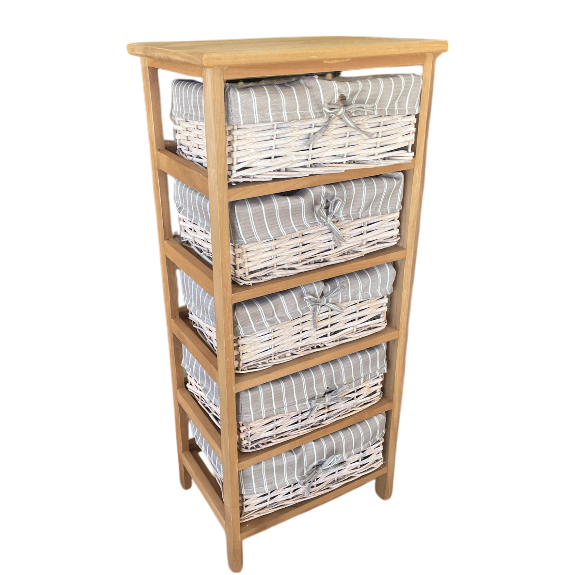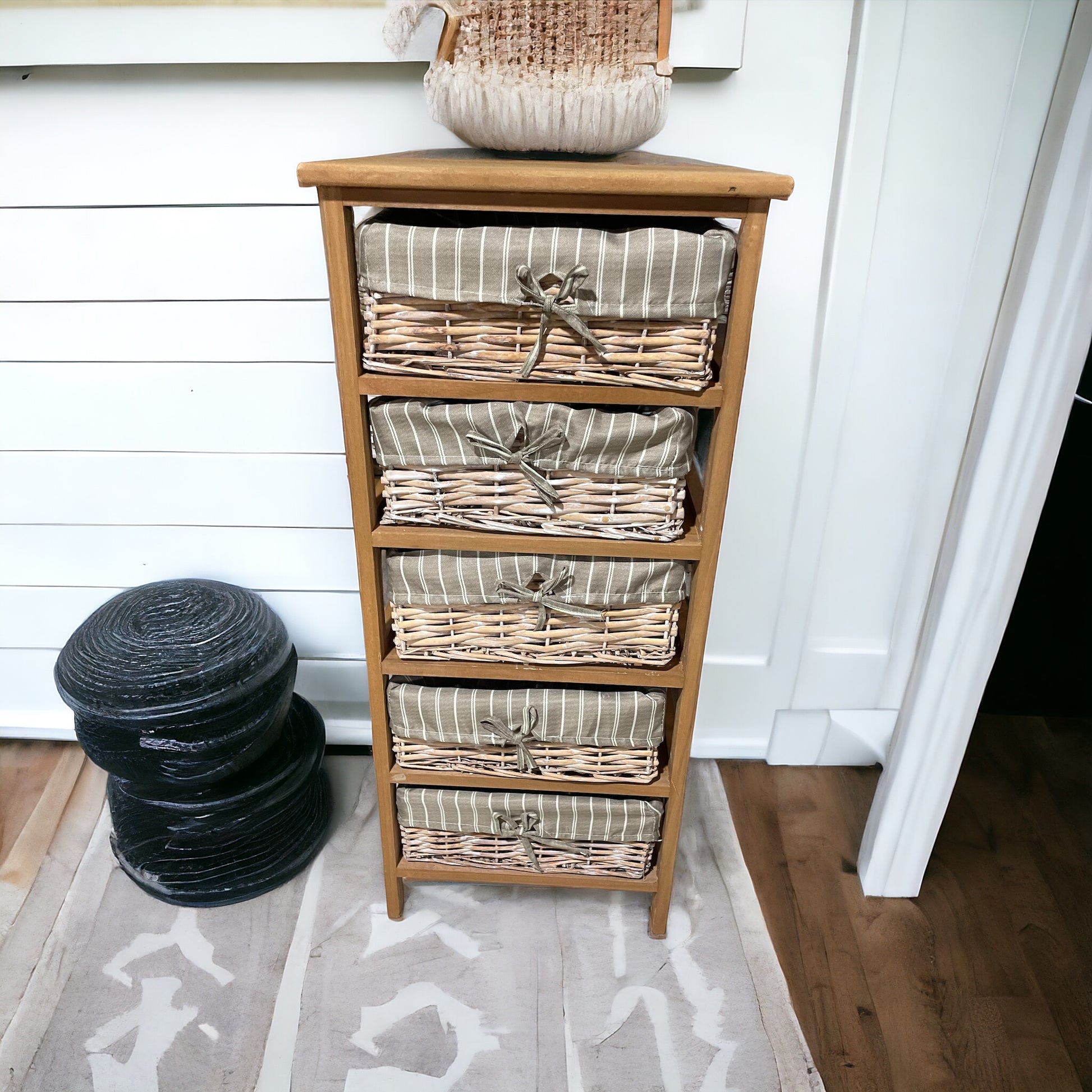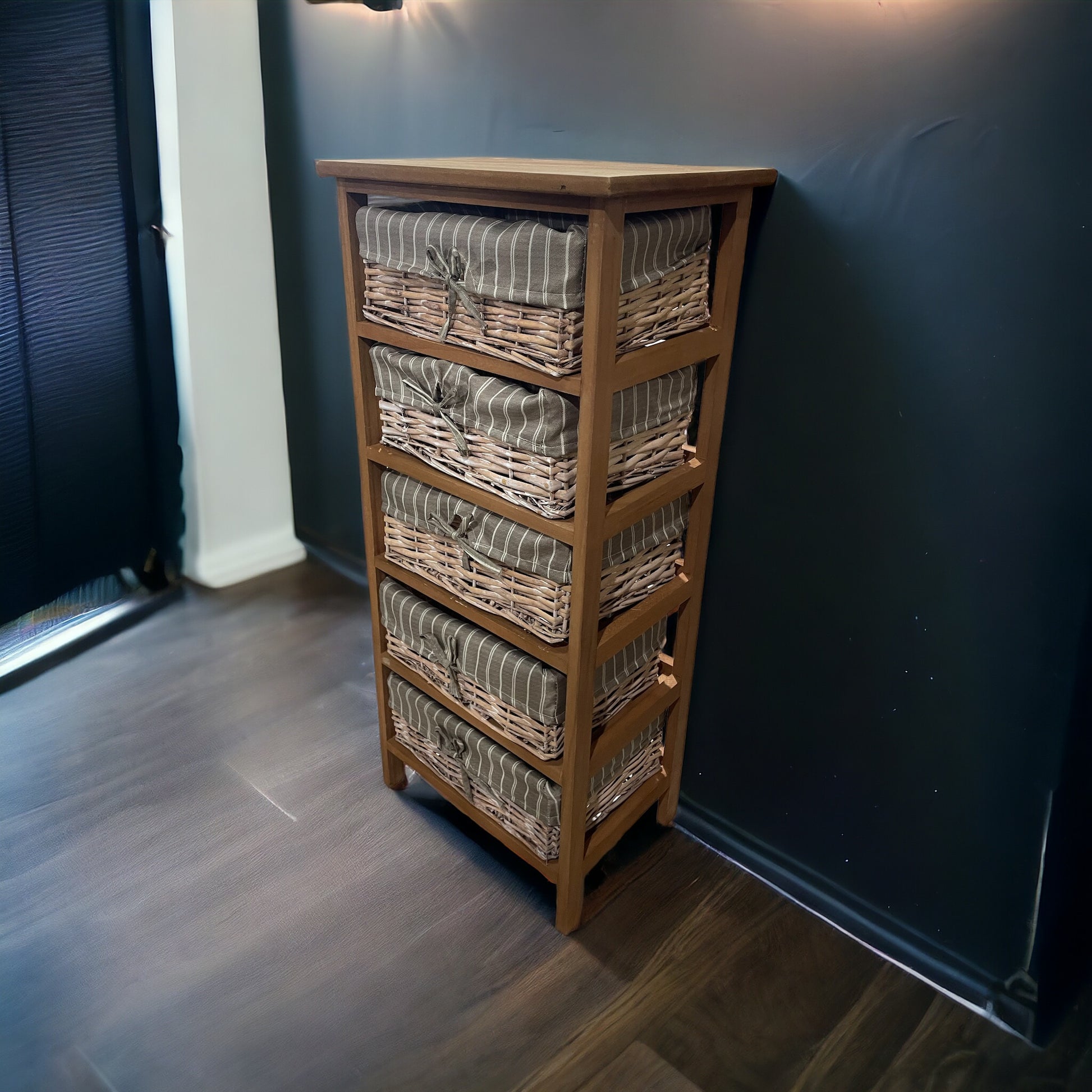 Fabricado con materiales de alta calidad, este mueble garantiza durabilidad y resistencia. Los canastos de mimbre, forrados en tela para mayor protección, ofrecen un espacio ideal para organizar y guardar tus pertenencias de forma ordenada y accesible.