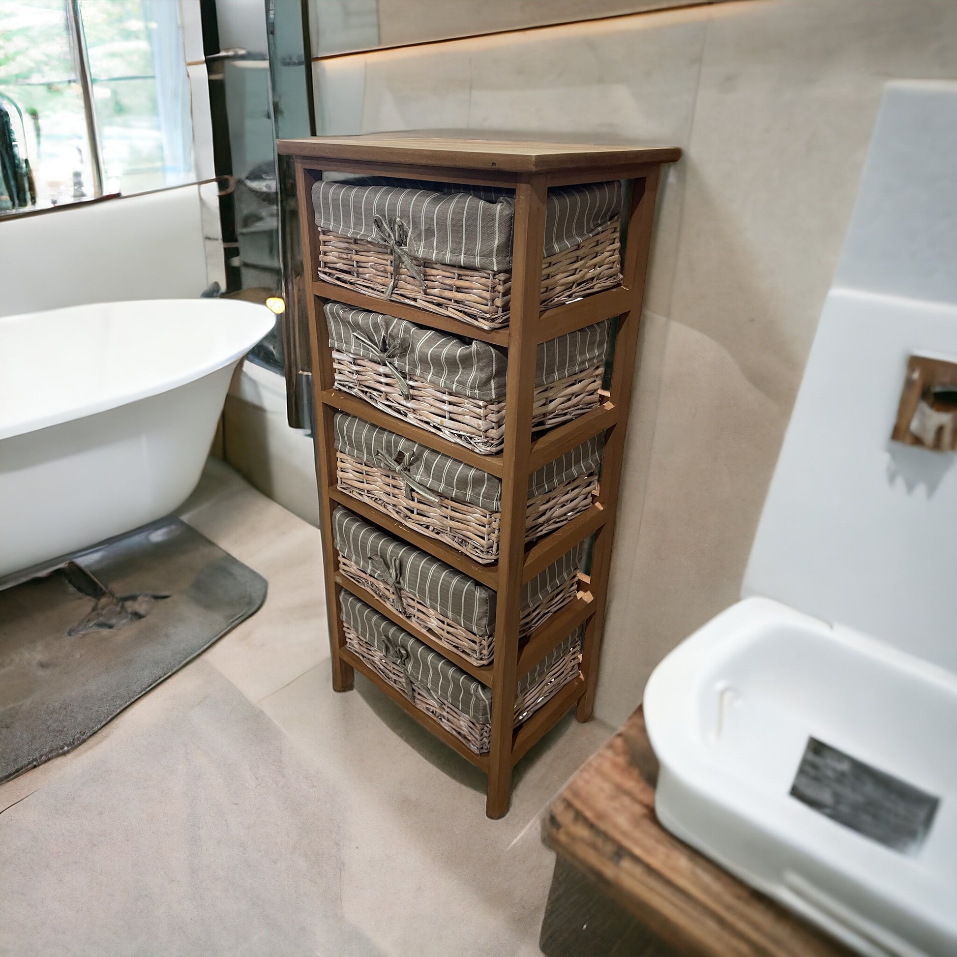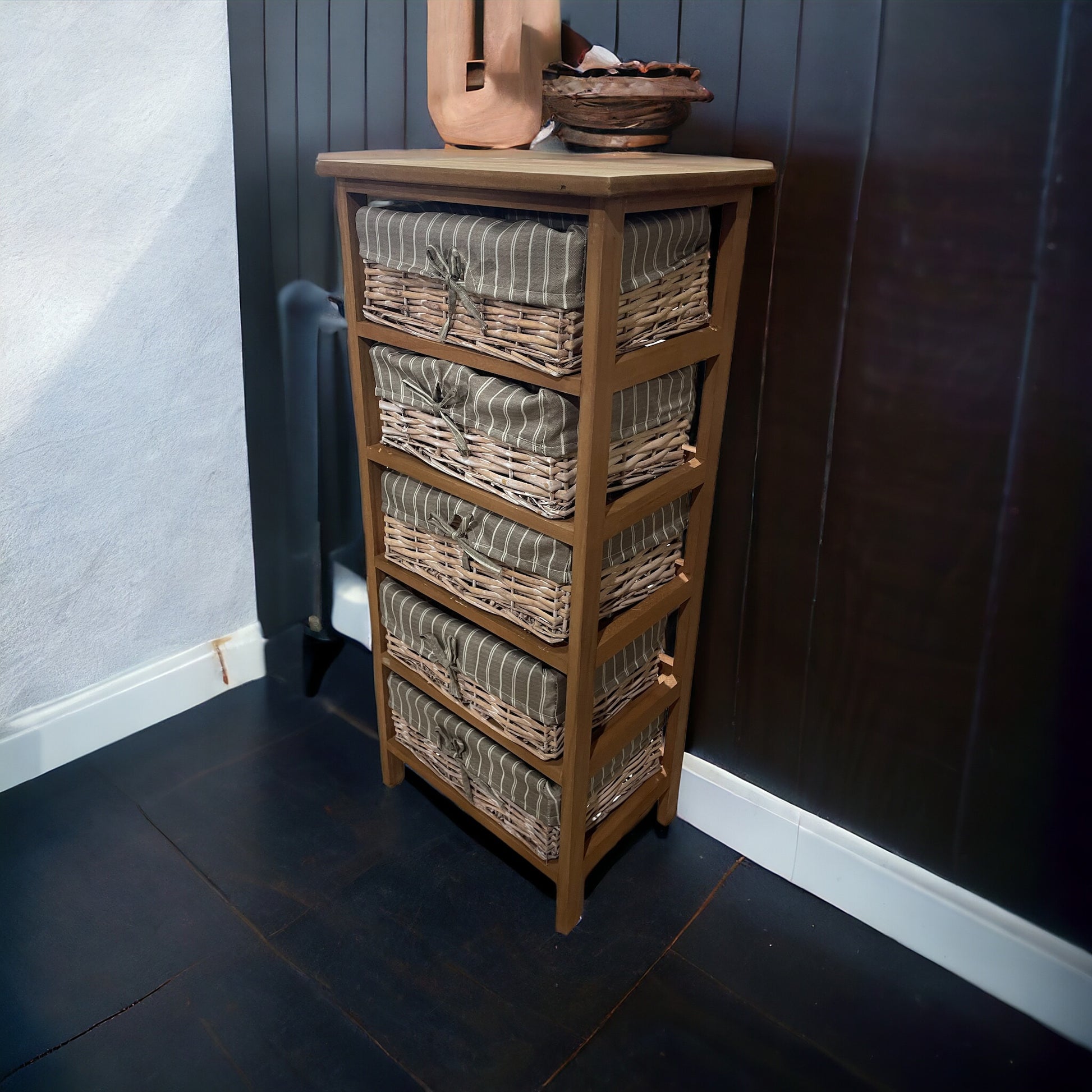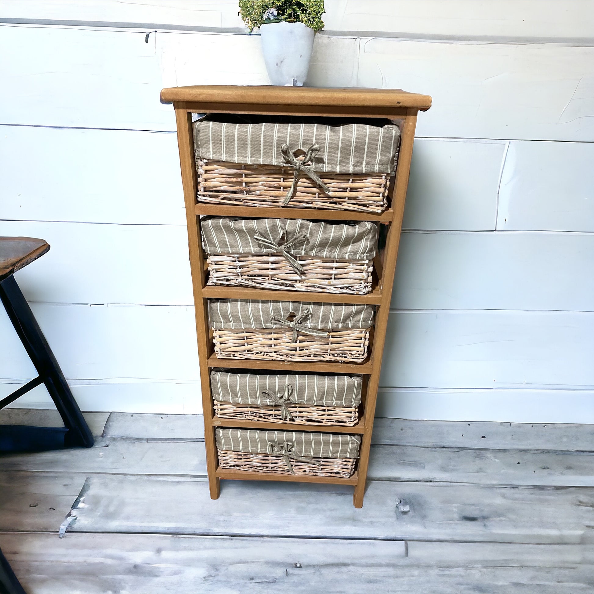 Fabricado con materiales de alta calidad, este mueble garantiza durabilidad y resistencia. Los canastos de mimbre, forrados en tela para mayor protección, ofrecen un espacio ideal para organizar y guardar tus pertenencias de forma ordenada y accesible.