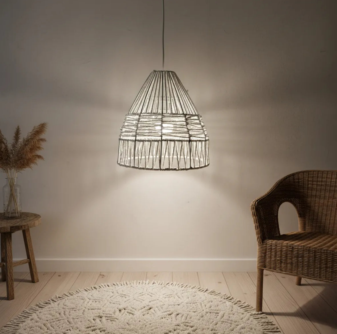 La luminaria Pekín es una pieza que destaca por su diseño geométrico y minimalista. Con un diámetro de 30 cm y una altura de 28 cm, esta luminaria es ideal para quienes buscan un toque de naturalidad y simplicidad en su hogar. Fabricada en símil rattán, su entramado abierto permite que la luz se difunda de manera suave, creando un ambiente relajado y acogedor.