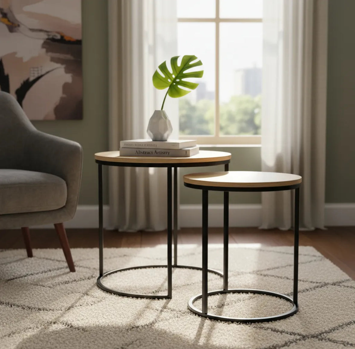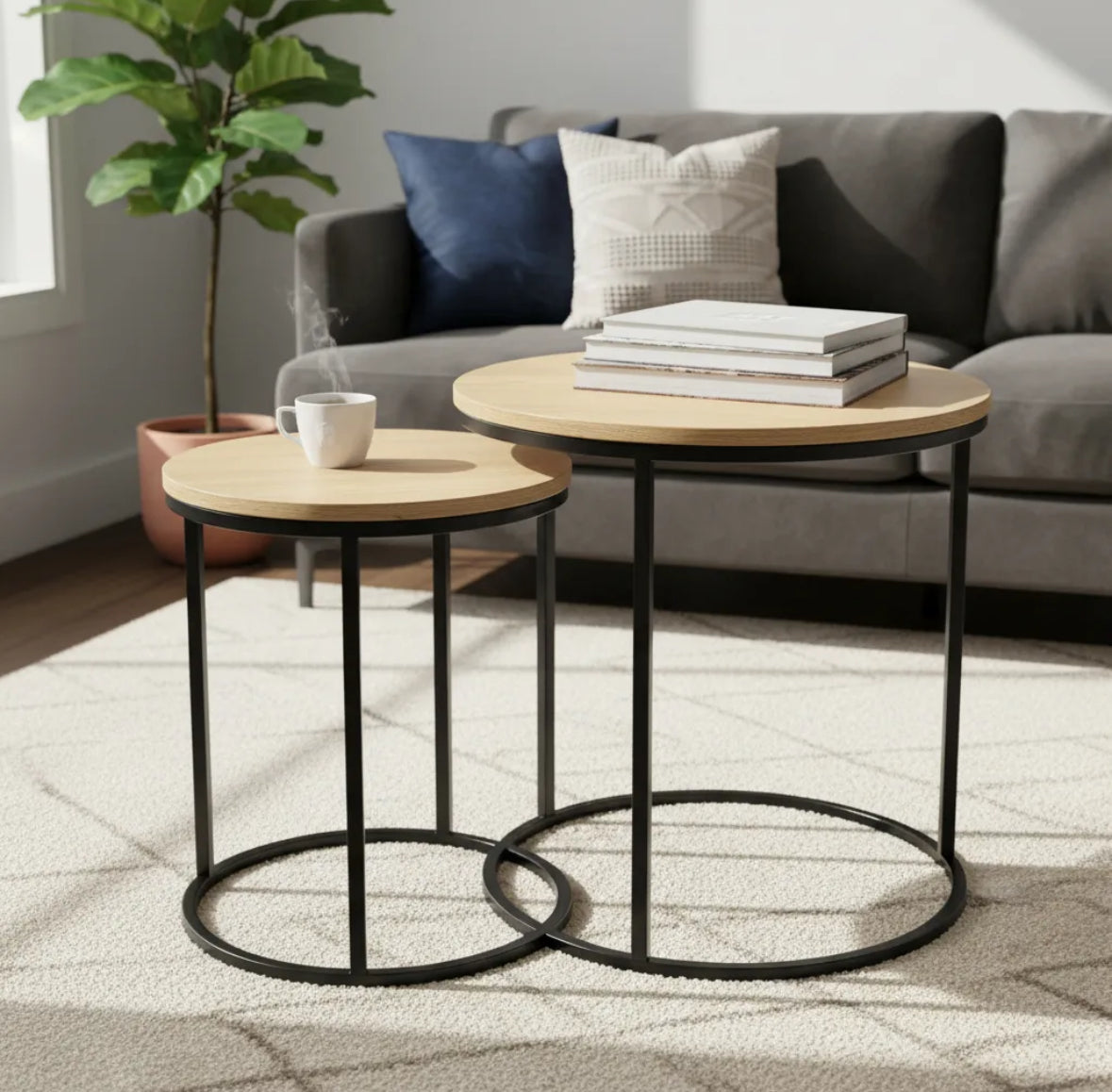 Este práctico pack incluye 2 mesas auxiliares redondas con estructura metálica y tapa de madera símil roble. Su diseño moderno y minimalista combina perfectamente con todo tipo de ambientes: living, dormitorio o espacios de estar.